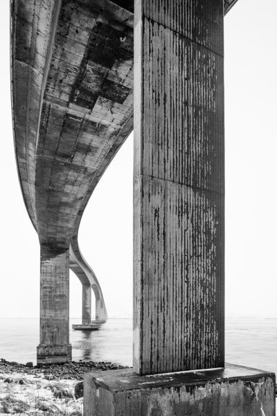 Als Nachmittagsrunde umrunden wir Kvalnes um erneut festzustellen, dass das bis raus auf Sandoya nichts bringt. Weiter Richtung Henningsvaer kommen starke Schneeschauer, die der Wind heftigst antreibt. Unter der Brücke über den Gimsoystraumen kann man architekturelle Bllder der Brückenkonstruktion machen,