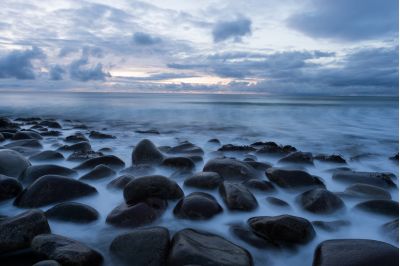 Der Sensor wird arg strapaziert, ein vorgelagerter Felsabschnitt ist mein heutiger Favorit. Spannend, immer wieder die unterschiedlichen Wasserbewegungen einzufangen. Die Flut läuft bereits wieder ein und als ich von meinem Felsen will, sehe ich einen breiten Wassergraben zum Ufer hin. Man sollte halt aufpassen, was das Meer macht. Der Felsen auf dem ich bin, ist bei Flut sowieso komplett versunken. Da hilft nur beherzt auf einen tangbewachsenen Felsen im knöcheltiefen Wasser zu treten und von da mit gewagtem Sprung (behindert sind nur Fotorucksack, dicker Parka, Stativ und Kamera in der Hand) auf einen ebensolchen Brocken unter Wasser auf der anderen Seite zu machen und mit Gewicht nach vorne verlagernd dann hoffentlich nicht rücklings ins Meer zu fallen. Geht gut, Schuhe nass, aber so schnell getreten, dass kaum Wasser reinlief. Nicht auszudenken, ich wäre auf den Algen ausgerutscht. Alternative wäre: Schuhe aus, Hose aus und durchs europäische Polarmeerwasser gewatet.