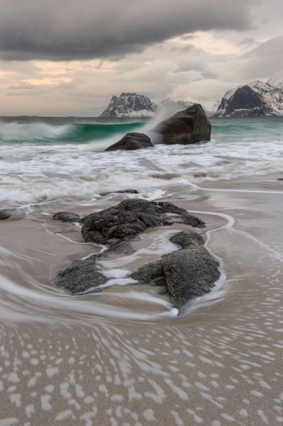 Langsam geht es heimwärts. In Skagsanden wird trotz Regen fotografiert. Zum einen weil gerade eine Meute eines Fotoworkshops sich geradlinig auf den Weg macht die fotogenen Sandstrukturen zu zertrampeln. Doch ich bin schneller und kann meine Beute sichern bevor diese achtlos wegen der Spiegelung am Sandstrand überrannt wird. Die Spiegelung habe ich schon eingesackt, die Meute wird sich schwer tun es trocken zu schaffen, denn die einlaufende Flut bringt Garantie für nasse Schuhe um die schwarzen Steine von der Meeresseite aus mit den Bergen im Hintergrund aufzunehmen. Meine Schuhe sind es schon.