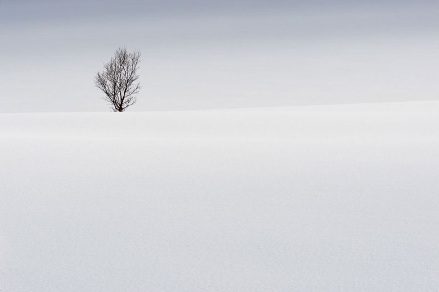 Es ist bewölkt, heftige Schneeschauer jagen draußen herum und so verbringen wir den Tag mit etwas Einkaufen. Als erstes fahren wir die Eisflächen bei Gimsoya an. Das Licht kommt diffus durch Wolkenlücken, der harschige Schnee glänzt etwas. Mit ein paar Krüppelbirkenresten versuche ich mich in "Zen-Fotografie" und mache das Bild später als schwarz/weiß Entwicklung fertig.