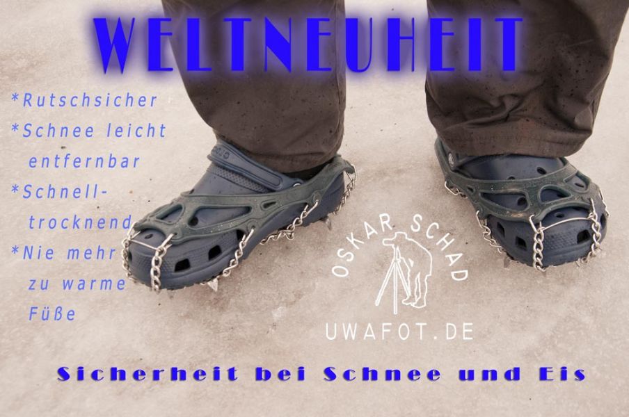 Mit den Crocs und den Eiskrallen für die Wanderschuhe machen wir noch einen besonderen Gag.