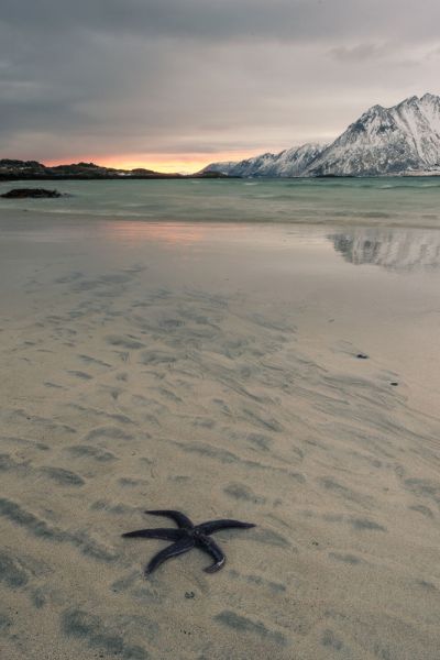 An einem Strandabschnitt nur 20 min weg, auf Gimsoya, warte ich bei Ebbe mit den Wattwürmern um die Wette. Ein einsamer Seestern liegt herum und wandert in einer halben Stunde ca. 15cm. Spannend dem zuzusehen während das Licht am Horizont einfach nicht will, etwas Zeitvertreib braucht man ja morgens.