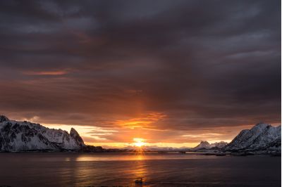 Vor dem Tor zum Tower stelle ich den Wagen ab und gehe um den Zaun des Towers herum. Nur ungünstige bzw. schlechte Perspektiven ergeben sich von dort aus, doch hinter dem Tower ist ein weiterer Hügel, von wo aus ich hoffe oben drüber sehen zu können. Im Tiefschnee erklimme ich den Hügel, der auf den von der Sonne teilweise ausgeaperten Stellen von Blankeis überzogen ist. Oben dann ein herrlicher Blick auf die Berge um den Austnesfjorden und genau in die Lücke zwischen den Inseln Stormolla und Litlmola, wo die Sonne gleich hervorkommt.