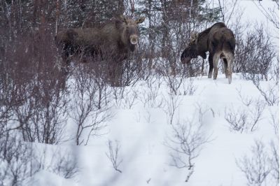 Die Straßen sind eisig, verharscht und teilweise schneesulzig. Kurz vor „Antoinettes-Spot“ bin ich gezwungen die Vollbremsfähigkeit unserer „Suzi Quattro“ mit ihren Spike-Pumps zu testen. Eine Elchmama quert mit zwei Jungtieren die Strasse. Zum Glück werden die Tiere schneller als ich angerutscht komme, trotzdem ist mein Bremsweg von 70km/h runter auf fast 0 bei den Witterungsverhältnissen etwa 100m lang.