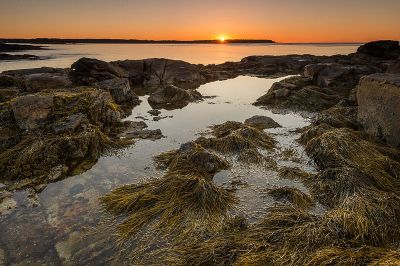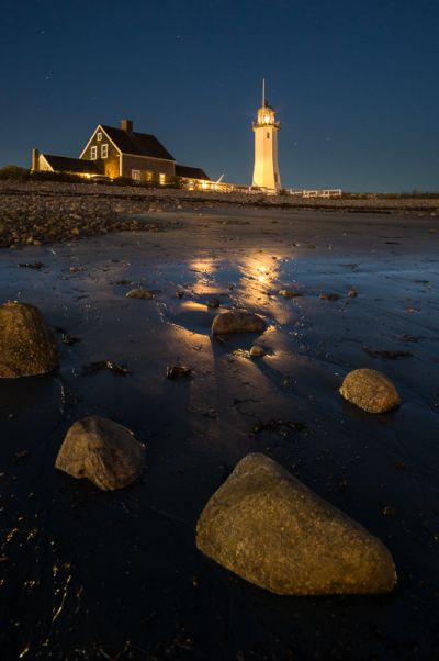 Unser erster Küstenpunkt sollte Hendrick Headlight sein, ein Leuchtturm mit nettem Bootshaus. Da wir uns verzetteln, kommen wir 10min vor Sonnenuntergang an. Doch leider ist der Leuchtturm und das Gelände weiträumig Privatbesitz (stand in meiner Recherche nirgends). Jetzt eilt es um schnell eine Perspektive zu finden, daher noch einmal zurückgefahren um aus der gegenüberliegenden Seite ein Bild zu machen. Geht aber nicht, da das alles Privatstrassen, -wege und private Grundstücke sind. Keine Chance. Zum Glück war es kurz nach Ebbe, die Flut rollte herein und wir konnten trockenen Fußes einen Felsen in der Bucht erklimmen, der bei nur einem halben Meter höheren Wasserstand nicht mehr erreichbar wäre. All das geschah in weniger als 10min, als wir auf dem Felsen aussen ankamen schlug der Himmel für einen Augenblick um. Wenig Minuten nach offiziellen Sonnenuntergang bot sich ganz kurz ein fantastisches Schauspiel.