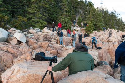 Es geht weiter zum Acadia Nationalpark. Nach 2,5h Fahrzeit sind wir da. Das bestellte Motelzimmer wird bezogen und dann auf zum Bass Harbor Lighthouse. Um da einen Fotoplatz für den Sonnenuntergang zu bekommen muss man früh da sein. Um 16:15 Uhr ist für 18:03 Uhr Sunset schon fast zu spät. Die ersten vier Stative stehen schon an den schönsten Plätzen. Wir zwängen uns mit rein. Die nächsten 1,5h vergehen mit Stativgeruckel, Neuankömmlingen und vorsichtiger Platzbehauptung. Auf den Klippen ist nicht viel Platz und schnell hat man in nebeneinander oder in zweiter Reihe im Weitwinkel den Nachbarn mit drauf. Mittlerweile dürften so an die 20 Stativ-Fotografen und noch einmal so viel Handyknipser dort sein. Besucher, die zu weit nach vorne laufen, also ins Bild geraten können, werden sehr deutlich auf ihr Fehlverhalten hingewiesen. Um 18:00 geht dann das Dauerfeuer los, um 18:15 Uhr ist der Platz bis auf wenige geräumt.