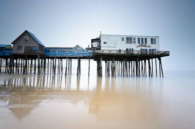 Auch heute klingelt der Wecker sehr früh. Um 4:00 Uhr verlassen wir das Hotel um 35 Meilen nördlich eine Seebrücke bei Dämmerung zu fotografieren. Irgendwie verpasse ich es, Kaffee zu besorgen und so gibt es bis zum Frühstück am späten Vormittag dann keinen Muntermacher. Davon brauche ich hier drei große Becher täglich um einigermassen zu einer Reaktion fähig zu sein. Die Seebrücke am Old Orchard Beach liegt im dichten Küstennebel, als wir gegen 5:00 Uhr dort ankommen. Trotzdem fotografieren wir 3,5 Stunden lang, mit von den Wellen nassen Hosen und teilweise ewig lange im kalten Antlantik stehend.