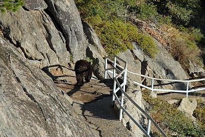 Als ich auf halben Weg unten bin, steht Tina keuchend wieder vor mir. Ein Schwarzbär ist direkt auf den Stufen entgegengekommen, keine Möglichkeit auf dem Felsen nach links oder rechts auszuweichen, nur Abgrund rundherum. Allerdings hat sich der Geselle dann von selbst getrollt. Tina hat noch einen Schnappschuß geschafft, bevor sie flüchtete.