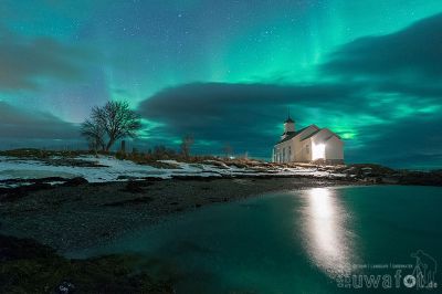 Gegen Mitternacht sehe ich aus dem Fenster um die Lage zu checken. Da ist etwas grünes. Unmöglich, bei dem Wetter. Kamera geholt, Probeschuss und tatsächlich: Es gibt eine große Wolkenlücke mit Aurora darüber. Schnell Tina geweckt, uns wetterfest angezogen und raus in die Nacht.