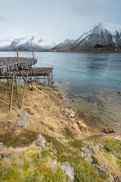 Gegen Mittag wird es etwas besser und bei 500m Sichtweite verlassen wir das Haus Richtung Leknes. Kurz mal Ballstad angesehen, aber da ist nicht nur der Fisch tot. Also rüber nach Haukland an den Strand. Es regnet jetzt. Ich versuche mich mit „Wasserbewegung auf Felsen“, dito das ganze noch einmal in Uttakleiv. Aber weder interessant Wolkenstrukturen noch passables Licht lassen das Ganze etwas werden. Abends lösche ich die Bilder wieder, nur Schrott.