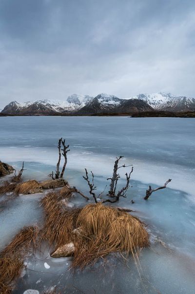 Am Straßenrand trinken wir etwas Tee bzw. Kaffee, dabei können wir jetzt dem einsetzenden Schneeschauer zusehen. Ein Strandabschnitt hat es uns angetan. Der Bach dorthin ist komplett gefroren und man sieht den Bachlauf als Eiskaskaden. Über Gimsoy führt uns die Strecke weiter. Ein zugefrorener See mit sicher mehr las 30cm dickem Blankeis reizt uns zum fotografieren. Man sieht durch die Risse im blanken Eis, wie dick es etwas sein muss. Ein Stück des Weges weiter ist ein weiterer zugefrorener See, das Licht neigt sich dem Abend zu, denn um 16:11 Uhr ist Sonnenuntergang.