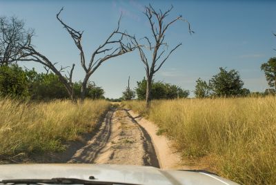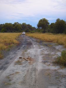Eine üble Schotterpiste mit Spurrillen führt weiter zum Southgate. Nach dem passieren des Veterinärkontrollzauns biegen wir ab auf das Parkgelände. Ab hier wird es über weite Strecken tiefsandig, aber noch einigermaßen gut zu fahren. Am Southgate wenden wir uns Richtung Third Bridge. Es geht durch Baumbestände und Savannenabschnitte auf grottenschlechten, teils sehr tiefsandigen Pfaden. Das Wetter meint es gut mit uns, von Regen im Osten keine Spur. Überhaupt ist das Okovangodelte recht ausgetrocknet. Eigentlich müsste hier alles voller Sumpf sein.