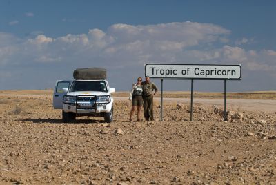 Einsanden. Nachher wird mittels bordeigenem Kompressor wieder Druck nachgefüllt. Wir verlassen die Wüste, fahren über Solitaire ( :-) ) nach Norden durch den Gaub Pass. Durch? Jawohl, Der Gaub-Pass ist eine Schlucht. Die Überquerung des Steinbock-Wendekreises wird dokumentiert, dann über die Berge am Kuiseb entlang nach Walvis Bay an der Küste.