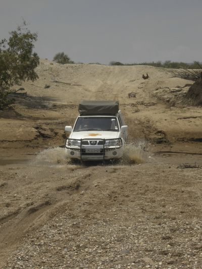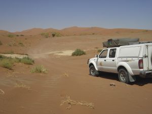 Beim Fahren aus den Dünen schaffe ich es doch wieder. Wir graben uns bis zur Achse ein. Hilft alles nichts, Schaufeln ist angesagt. In dieser Hitze eine Tortur. Der zweite Reservereifen hängt unter dem Auto und bildet gegenüber dem kleinen Differential der Hinterachse, welches auf gleicher Höhe liegt, eine viel größere Angriffsfläche wenn man sich eingegraben hat. Sobald ich bis dahin im Sand stecke, wirkt das Reserverad wie ein Sandschaufel und es geht weder vor noch zurück. Auch das wird gemeistert und nun endlich der Reifenluftdruck abgelassen. Das vergrößert die Auflagefläche der Reifen und hilft wirksam gegen das