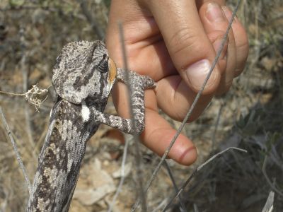 Wir haben herrlich geschlafen, doch wie hier üblich wecken uns früh die Sonne und die Geräusche deserwachenden afrikanischen Kontinents. Es wird gefrühstückt und dann zurück um den Berg zum Farmhausgefahren. Ich kaufe mir ein großes, rasiermesserscharfes, hand-gefertigtes Messer von Rene mit Lederscheide. Es wird mein Begleiter am Gürtel während der ganzen Tour, lediglich wenn ich zum Schlafen die Hose ausziehe liegt es im Zelt neben mir. Ein sehr brauchbares Werkzeug, welches mit einem Hieb dünne Äste durchtrennt, sowie trockene Holzspeitel fürs Feuermachen abhackt, oder mein geräuchertes Fleisch hauchdünn schneidet. Rene zeigt mir auch noch, wie man es perfekt schleift und schärft. Mittlerweile sind wir übereingekommen, statt der Botswana-Pläne uns ihnen ab Abu Huab im Damaraland anzuschließen. Das Kaokoveld gilt als der unberührteste Teil Namibias, in ihm leben die Stämme der Himbas, einem Ureinwohnervolk. Wir wollten schon früher gerne dorthin, aber man sollte mit mindestens zwei Fahrzeugen im Kaokeveld unterwegs sein, um in der Abgeschiedenheit bei Pannen sich gegenseitig unterstützen zu können. Ansonsten kommt dort sehr selten jemand vorbei, 3-4 Tage oder gar eine Woche kann es schlimmstenfalls dauern bis andere Fahrzeuge auftauchen, erst vor zwei Monaten sei ein Pärchen verdurstet. Froh über die Möglichkeit in dieses Gebiet dank einer ortskundigen Begleitung durch Rene zu kommen ändern wir unseren Plan.