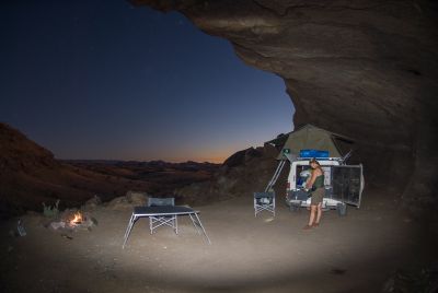 Als ich vor der Auffahrt stehe, verschlägt es mir die Sprache. Ich soll einen künstlich aufgeschütteten Schotterkeil bis auf ca. 15m Höhe befahren um dann in einer Höhle zu campen. Mit Schwung und Getriebeuntersetzung gelingt auch das. Ein reizvoller Platz hier oben. Zu den Duschen, eingebaut in eine Felsnische, sowie den Toiletten ist es ein Stück an den vorher bereits gesichteten Fahrzeugen vorbei. Seltsam, die Zelte sind offen, auch die PKW’s unverschlossen, die offenen Moskitonetze flattern aus den Zelten heraus im Wind. Aber niemand hier. Von den Arbeitern ist auch keiner mehr zu sehen. Wir erklimmen den Hügel ganz, halten Ausschau rundherum, aber außer Landschaft ist nichts zu sehen. Dafür gibt es schöne Fotos von der Abendstimmung und wieder einen schönen Ausblick über das Land. Als es dunkel wird, wird es uns doch unheimlich. Immer noch niemand zu sehen. Keine Menschenseele. Stand da nicht in der namibischen Tageszeitung ein Bericht über Überfälle auf Farmen mit Ermordung aller Anwesenden?