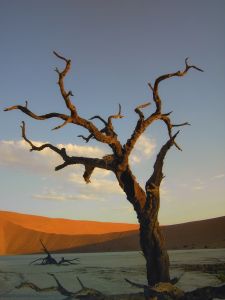 mitgenommen zu haben. Obwohl wir später sehr viel tranken, jeder fast 5 Liter an diesem Tag und auch am nächsten wieder, mussten wir beide jeweils nur einmal abends Wasser lassen. Unglaublich, was über die Atmung und den Schweiß verdunstet. Aber das Fotolicht am Abend war es wert. Trotzdem gehen wir noch hinüber ins Deadvlei, machen ein paar Fotos bei untergehender Sonne. Sogar einen Hasen sehe ich hier mitten in der Wüste.
