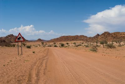 Kurz nach Uis verlassen wir die Hauptpiste um durch ein Tal, wo es Wüstenelefanten geben kann, Richtung Aba Huab zu gelangen. Die Piste ist landschaftlich sehr reizvoll gelegen, es hat aber immer wieder Tiefsandpassagen, vor allem im ausgetrockneten Flussbereich.