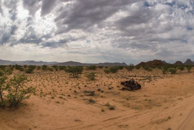 Von Henties Bay führt die Piste eintönig und monoton durch die Skeletton Coast Wüste am Brandberg vorbei nach Nordosten.
