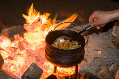 Pärchen unserem Vorhaben anschließen will. Das klingt nicht schlecht, denn mit 3 Fahrzeugen wird die Sicherheit erhöht. Wir grillen uns abends zwei Steaks und testen das erste Mal den Poitje für eine Art Eintopf. Die Zubereitung im Feuer geht rasend schnell, ebenso die Reinigung des gusseisernen Topfes. Es gibt warme