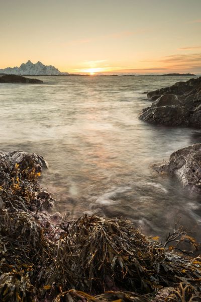 So fahren wir heute an die Südküste von Vestvagoya. Eine Herausforderung ist nur, dass bei Ebbe, bzw. davor und danach, das Ufer voller jetzt sichtbarer, diverser Algen ist. Diese zwar im Detail schönen Algensorten geben insgesamt aber nur einen hässlichen braunen Streifen zwischen Wasser und Schnee am