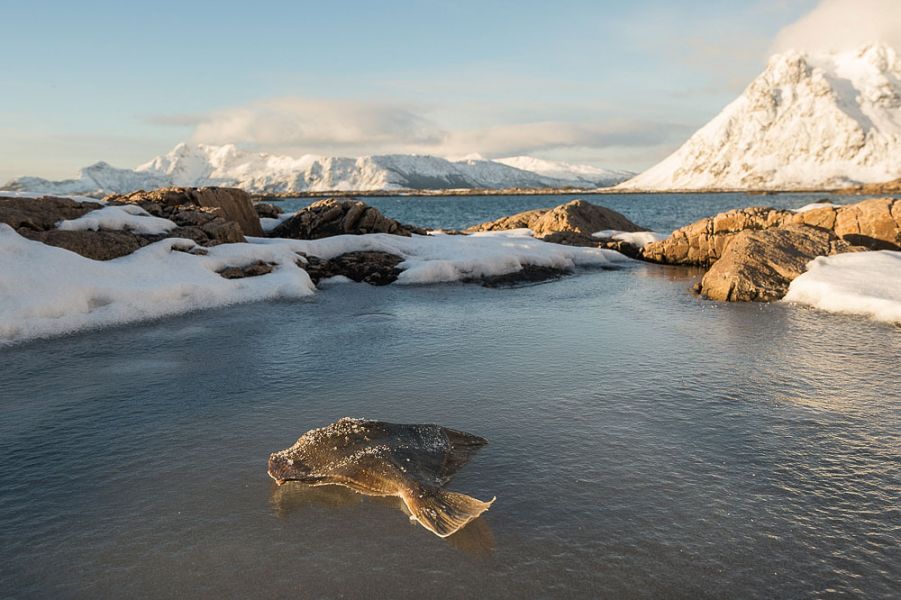 An einem Strandabschnitt nur 20 min weg, auf Gimsoya, warte ich bei Ebbe mit den Wattwürmern um die Wette. Ein einsamer Seestern liegt herum und wandert in einer halben Stunde ca. 15cm. Spannend dem zuzusehen während das Licht am Horizont einfach nicht will, etwas Zeitvertreib braucht man ja morgens.
