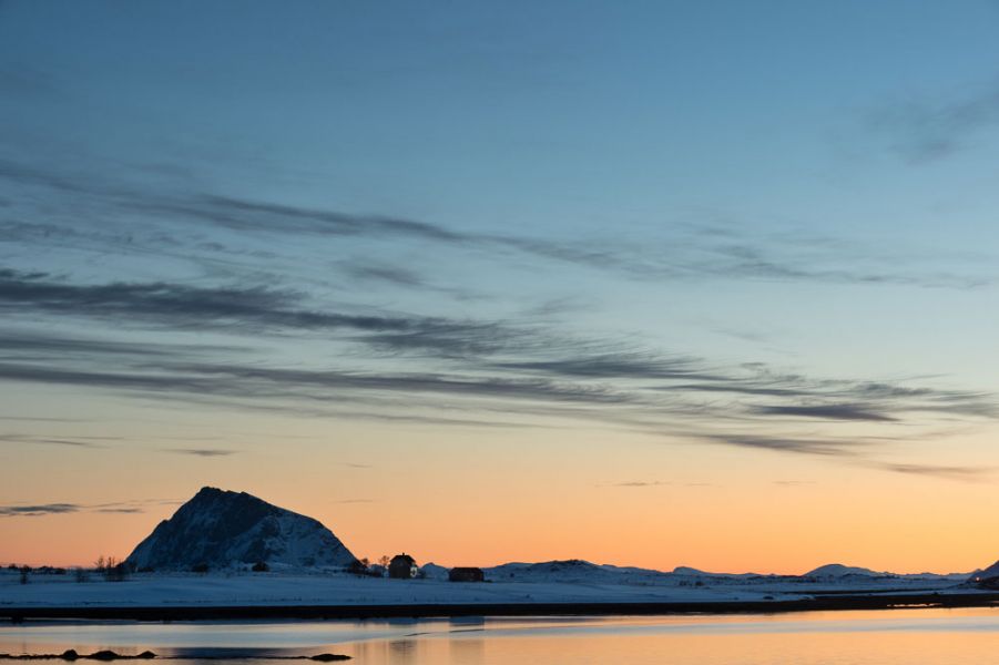 Vor dem Tor zum Tower stelle ich den Wagen ab und gehe um den Zaun des Towers herum. Nur ungünstige bzw. schlechte Perspektiven ergeben sich von dort aus, doch hinter dem Tower ist ein weiterer Hügel, von wo aus ich hoffe oben drüber sehen zu können. Im Tiefschnee erklimme ich den Hügel, der auf den von der Sonne teilweise ausgeaperten Stellen von Blankeis überzogen ist. Oben dann ein herrlicher Blick auf die Berge um den Austnesfjorden und genau in die Lücke zwischen den Inseln Stormolla und Litlmola, wo die Sonne gleich hervorkommt.