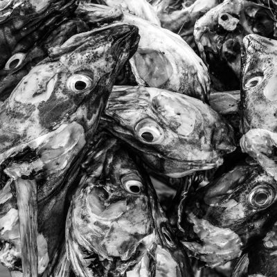 Ein paar landestypische, getrocknete Fischköpfe für den Export: