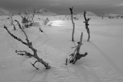 Es ist bewölkt, heftige Schneeschauer jagen draußen herum und so verbringen wir den Tag mit etwas Einkaufen. Als erstes fahren wir die Eisflächen bei Gimsoya an. Das Licht kommt diffus durch Wolkenlücken, der harschige Schnee glänzt etwas. Mit ein paar Krüppelbirkenresten versuche ich mich in "Zen-Fotografie" und mache das Bild später als schwarz/weiß Entwicklung fertig.