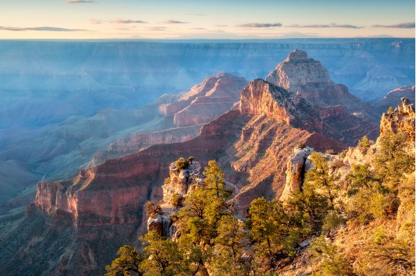 Dann ab nach Northrim am Grand Canyon. Da kommen wir erst nachts um 22:00 Uhr an. Es ist bitterkalt, Schnee liegt auch schon. Wir sind auf 2700 m ü. NN. Da um diese Zeit die Campingplätze und Lodges voll sind, schlafen wir einfach am Straßenrand im Auto. In den Schlafsäcken eingemummelt auf den Vordersitzen geht das schon. Schließlich wollen wir um 5:15 Uhr schon raus um das Morgengrauen am Grand Canyon zu erleben.