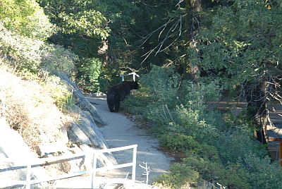 Als ich auf halben Weg unten bin, steht Tina keuchend wieder vor mir. Ein Schwarzbär ist direkt auf den Stufen entgegengekommen, keine Möglichkeit auf dem Felsen nach links oder rechts auszuweichen, nur Abgrund rundherum. Allerdings hat sich der Geselle dann von selbst getrollt. Tina hat noch einen Schnappschuß geschafft, bevor sie flüchtete.