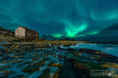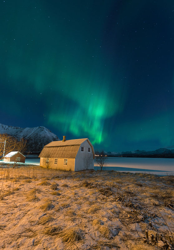 Gegen Mitternacht sehe ich aus dem Fenster um die Lage zu checken. Da ist etwas grünes. Unmöglich, bei dem Wetter. Kamera geholt, Probeschuss und tatsächlich: Es gibt eine große Wolkenlücke mit Aurora darüber. Schnell Tina geweckt, uns wetterfest angezogen und raus in die Nacht.