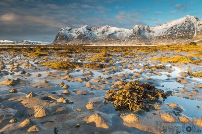 Gegen 12:00 Uhr beschließen wir wegen der Wolken am Himmel nach Süden, also Reine, aufzubrechen. In Leknes müssen wir Brot und Getränke nachkaufen. Das Wetter wird schlechter. Es zieht mehr zu, der Wind bekommt starke Böen. In Flakstad möchte ich die vom Wind geformten Strukturen im Sandstrand aufnehmen. Als ich jedoch die Autotür öffnen will, drückt sie der Wind so zu, dass ich Mühe habe mich dagegen zu stemmen.