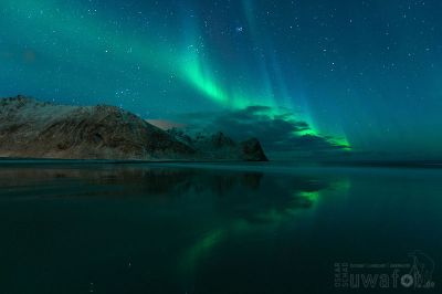 Tina und ich fahren jedoch wegen der Kürze des Weges in Ferienhaus und essen erst etwas. Für die Nacht füllen wir die Thermoskannenvorräte auf, dann treffen wir auch schon in Eggum ein. Deryk begrüßt mich im Auto und meint: „Tolle Show, was? Habt ihr das drauf. Fette Beute, oder?“. Als wir etwas verwirrt reagieren, meint er: „Na, die Polarlichtexplosion. War das toll, oder? Also wir haben geile Bilder absahnen können“. Jetzt dämmert es uns allen erst.: Er war der Meinung wir wären in der finsteren Nacht bei all den Leuten dabei gewesen. Als er uns die Bilder zeigt, sind wir platt. Während wir essen waren ging hier die Post ab. Das hatten wir komplett versäumt. Also stapfen wir an den Strand und nehmen bis früh morgens mit, was noch so ab und zu am Himmel erscheint. Klägliche Reste.