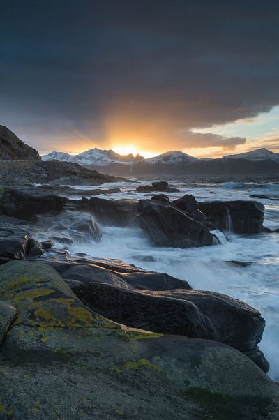 Mittlerweile scheint sogar die Sonne und wir genießen den Vormittag in vollen Zügen. Es ist mit 3°C ohne Wind auch nicht wirklich kalt. In Reine haben wir noch schönes Stimmungslicht, dann geht’s nordwärts. Bei Vikten haben wir einen unglaublichen Sonnenuntergang hinter der Bergkette und über dem Fjord.