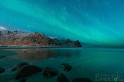 Ein wenig nehmen wir noch Reflektionen auf den schwarzen Steinen am Strand mit, dann ist es fast Nacht. Ein allererstes Glimmen zeigt sich am Himmel. Erneut sehr früh für eine Aurora. Allerdings wird es den ganzen Abend nur schwach bleiben, sehr diffus, wenig agil. Trotzdem reicht es für unsere Fotosensoren.