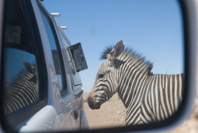 geländeüberschauend auf einem Hügel, um bei Fahrzeugbewegung sofort dorthin zu galoppieren. Oft folgen die Strausse hinterher. Wir kommen nicht vorbei und müssen zurück zur Farm, Hilfe holen. Die Farmerin drängt ihr Zebra mit dem Auto ab, die mitgekommenen Arbeiter verhindern das es seitlich ausbricht. So können wir das Gatter nun öffnen und uns verabschieden.