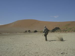 mitgenommen zu haben. Obwohl wir später sehr viel tranken, jeder fast 5 Liter an diesem Tag und auch am nächsten wieder, mussten wir beide jeweils nur einmal abends Wasser lassen. Unglaublich, was über die Atmung und den Schweiß verdunstet. Aber das Fotolicht am Abend war es wert. Trotzdem gehen wir noch hinüber ins Deadvlei, machen ein paar Fotos bei untergehender Sonne. Sogar einen Hasen sehe ich hier mitten in der Wüste.