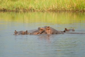 Am Khwai eingetroffen machen wir uns auf die Suche nach den Flusspferden. Wir durchqueren ein Wäldchen und treffen unvermittelt auf einen Hippo-Pool. Zum Fotografieren steigen wir aus, doch Tina kommen die Geräusche aus dem Unterholz seltsam vor. Da entdecke ich, dass wir sehr ungünstig stehen. Vor dem Auto ist eine Schneise im Schilf, wohl ein Flusspferdweg? Der Trampelpfad führt unter unserem geparkten Nissan durch zu den Geräuschen im Gebüsch. Jetzt aber schnell weg. Es gibt wohl kaum was Schlimmeres als einem Hippo den Weg zum Wasser abzuschneiden. Sicherheitshalber fahren wir gleich weiter. Bald finden wir wieder Hippos, ein ganzes Rudel suhlt sich im Wasser. Wir bleiben zwanzig Minuten in kaum 30m Entfernung stehen um sie zu beobachten und zu fotografieren, allerdings mit