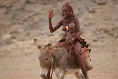 Wir verabschiedeten uns wieder vorübergehend von ihnen, um die Weiterfahrt nach Opuwo fortzusetzen. Der Treffpunkt in Opuwo war für alle klar. Tina nutzt die Gelegenheit für eine SMS Nachricht nach Hause, denn nur direkt in Sesfontein ist in Reichweite des Sendemastes Mobiltelefonempfang möglich. Wir hoffen in Opuwo dann die Antwort erhalten zu können. Es wäre für die nächsten vier Tage die letzte Möglichkeit. Auf dem Weg nach Opuwo geht es teilweise wieder über hohe Hügel, von Bergen möchte ich nicht sprechen, durch abschnittsweise sehr grüne Wiesen und Wälder mit Rinderherden. Auch zu regnen fängt es zweimal an, jedoch nur sehr lokal begrenzt. In einem Abschnitt stehen alte Affenbrotbäume, die Baobabs. Die bauchigen Stämme haben riesige Umfänge, die Früchte erreichen Melonengröße, nur in länglicher Form. Wir steigen aus um die Bäume zu fotografieren. Als wir zurückgehen, steht wie aus dem Nichts plötzlich ein Himba-Junge mit seinem Esel am Wegesrand. Er frägt uns nach Getränken, da er durstig sei. Allerdings hat er so große Angst vor mir Bleichgesicht (oder vor dem am Gürtel baumelnden Messer), dass er unbedingt die Flasche auf den Boden gestellt haben will, um sie sich dann in Ruhe wenn wir weg sind zu nehmen. Ich kann ihn von meinen besten Absichten überzeugen, und gebe ihm direkt die Flasche. Später willigt er sogar ein, Fotos von ihm machen zu dürfen.