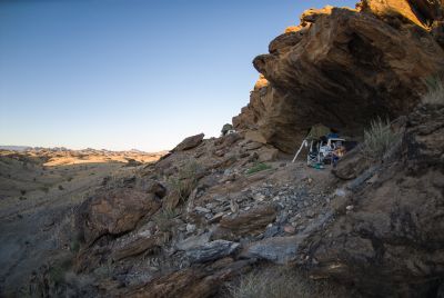 Als ich vor der Auffahrt stehe, verschlägt es mir die Sprache. Ich soll einen künstlich aufgeschütteten Schotterkeil bis auf ca. 15m Höhe befahren um dann in einer Höhle zu campen. Mit Schwung und Getriebeuntersetzung gelingt auch das. Ein reizvoller Platz hier oben. Zu den Duschen, eingebaut in eine Felsnische, sowie den Toiletten ist es ein Stück an den vorher bereits gesichteten Fahrzeugen vorbei. Seltsam, die Zelte sind offen, auch die PKW’s unverschlossen, die offenen Moskitonetze flattern aus den Zelten heraus im Wind. Aber niemand hier. Von den Arbeitern ist auch keiner mehr zu sehen. Wir erklimmen den Hügel ganz, halten Ausschau rundherum, aber außer Landschaft ist nichts zu sehen. Dafür gibt es schöne Fotos von der Abendstimmung und wieder einen schönen Ausblick über das Land. Als es dunkel wird, wird es uns doch unheimlich. Immer noch niemand zu sehen. Keine Menschenseele. Stand da nicht in der namibischen Tageszeitung ein Bericht über Überfälle auf Farmen mit Ermordung aller Anwesenden?