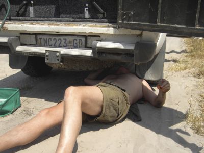 Bremsseilzügen herausgerissen. Aber ich habe Zeit zum Nachdenken gewonnen ohne weiter Diesel zu verlieren. Das war Dieseldusche Nummer zwei heute, also wieder Körperreinigung mit Sand und Spülmittel. Ich höre Fahrzeugbrummen, ein südafrikanischer Tourguide kommt mit Freunden um auch hier in der Nähe zu übernachten. Ich schildere ihm meine Lage und nach Durchsuchen seines Fahrzeuges schneiden wir ein Stück Gummischlauch seiner Handluftpumpe ab. Er fährt wieder, wünscht mir viel Glück.