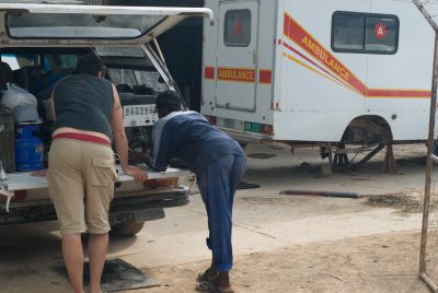 Rückkaufgarantie in Südafrika gekauft, da sie insgesamt 4 Monate durchs südliche Afrika reisen wollen. Nun haben sie schon zweimal den Reifen mit einem Pfropfen flicken lassen, aber auf dem Weg nach Opuwo riss der Auspuff ab. Der muss geschweißt werden. außerdem hat der Kompressorkühlschrank ein Thermostatproblem und kühlt nicht mehr. Bei uns ist am Dachzelt durch das Gerüttel auf den Pisten der Stahlschenkel des Klappscharniers gebrochen. Ebenfalls ausbauen und schweißen lassen. Rene’s Kühlschrank im Pinzgauer hat auch alles Kühlmittel verloren, muss gefüllt werden. In Opuwo anscheinend alles kein Problem. In kürzester Zeit wird jedem von uns geholfen, frisch repariert können wir der nun ins “Outback” gehenden Tour sorglos entgegensehen. Lediglich der Ambulanz scheint es nicht so zu gehen. Das Fahrzeug steht im Werkstatthof, seit Wochen ohne Hinterachse da kein Ersatzteil verfügbar ist. Aber egal, in der “Wildnis” muss man sich eher selbst zu helfen wissen und Verantwortung übernehmen. Man kann und darf nicht auf die Vollkaskoversorgung wie in Europa vertrauen.