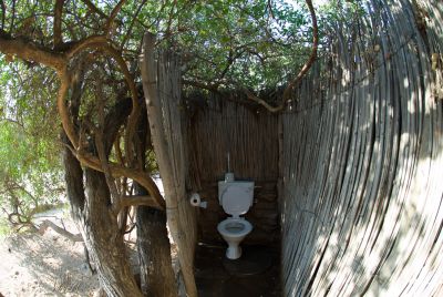Duschen, welche durch den s.g. Donkey, einem Boiler mit offener Holzheizung, versorgt werden. Die Duscharmaturen sind in einem Baum befestigt und wirkt sehr urig. Die Toiletten verwundern. Da stehen zwischen Büschen nur auf drei Seiten mit Rohrmatten gegen Einblick gesichert, tatsächlich Porzellantoiletten