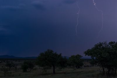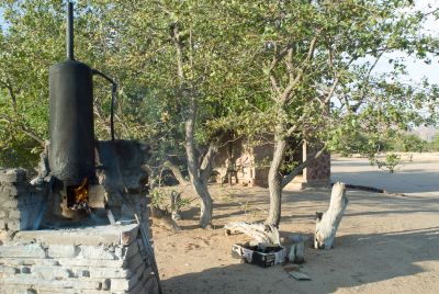 Heidi bietet uns für die Unterstützung bei der Stahlbesorgung kostenlos eines ihrer Gästezelte an, die mit dem echten “Out-of-africa-feeling”. Gerne nehmen wir das Angebot an, fahren um den Berg herum auf die Nordseite und beziehen diese offenen Zelte auf Betonfundament mit Doppelbetten und Dusche/WC. Elektrizität gibt es hier keine. Etwas entfernt haben sie in die Savanne ein Loch gegraben, mit Beton und Steinen ausgekleidet sowie eine Holzplattform installiert. Sozusagen ein Pool mitten in der Wildnis, in dem wir uns nun erfrischen und bei untergehender Sonne eine Flasche südafrikanischen Rotwein genießen. Dann schnell ein Feuer gemacht um das Abendessen, ein Kudu-Antilopensteak, zu Grillen und dann müde zu Bett gegangen. Der Sternenhimmel ist hier fantastisch, denn es hat Neumond und störendes Umgebungslicht gibt es überhaupt nicht. Die Nacht ist wirklich undurchdringlich schwarz.