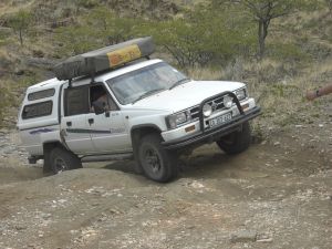 Am Flughafen in Windhoek holt uns nach kurzer Wartezeit dann der Fahrer von KEA Campers (22°34’21.23?S, 17° 6’2.84?E), dem Fahrzeugvermieter, ab. In nur 30 min sind wir im Zentrum, regeln das vertragliche zur Fahrzeugübernahme. Wir staunen nicht schlecht, dass es dieses Mal ein nur ein Jahr alter Nissan 4×4 ist. Leider vermissen wir die 2 x 20l Zusatzkanister. Während wir in den nahen Supermarkt zum Einkaufen gehen um uns für mindestens die nächste Woche einzudecken, schraubt man kurzerhand hinter die Kompressorkühlbox eine Halterung und montiert darin die Kanister. Jetzt kann man zwar den Schub darunter nicht ganz schließen, weil die Schrauben “afrikanisch” lang geblieben sind, aber es stört nicht. Es erfolgt die Übergabedokumentation mit Camping-Packliste und Einweisung in die 15-Gang-Schaltung (5xHigh, 5xLow, 5xUntersetzung) mit Differentialsperre. Dabei wird auch jeder Steinschlag und Lackfehler am Fahrzeug festgehalten, für evtl. spätere Regressforderungen bei der Rückgabe. Gegen ein kleines Bakschisch bekommen wir auch einen Poitje, also einen gusseisernen Topf auf Beinen, für das Kochen im Feuer überlassen.
